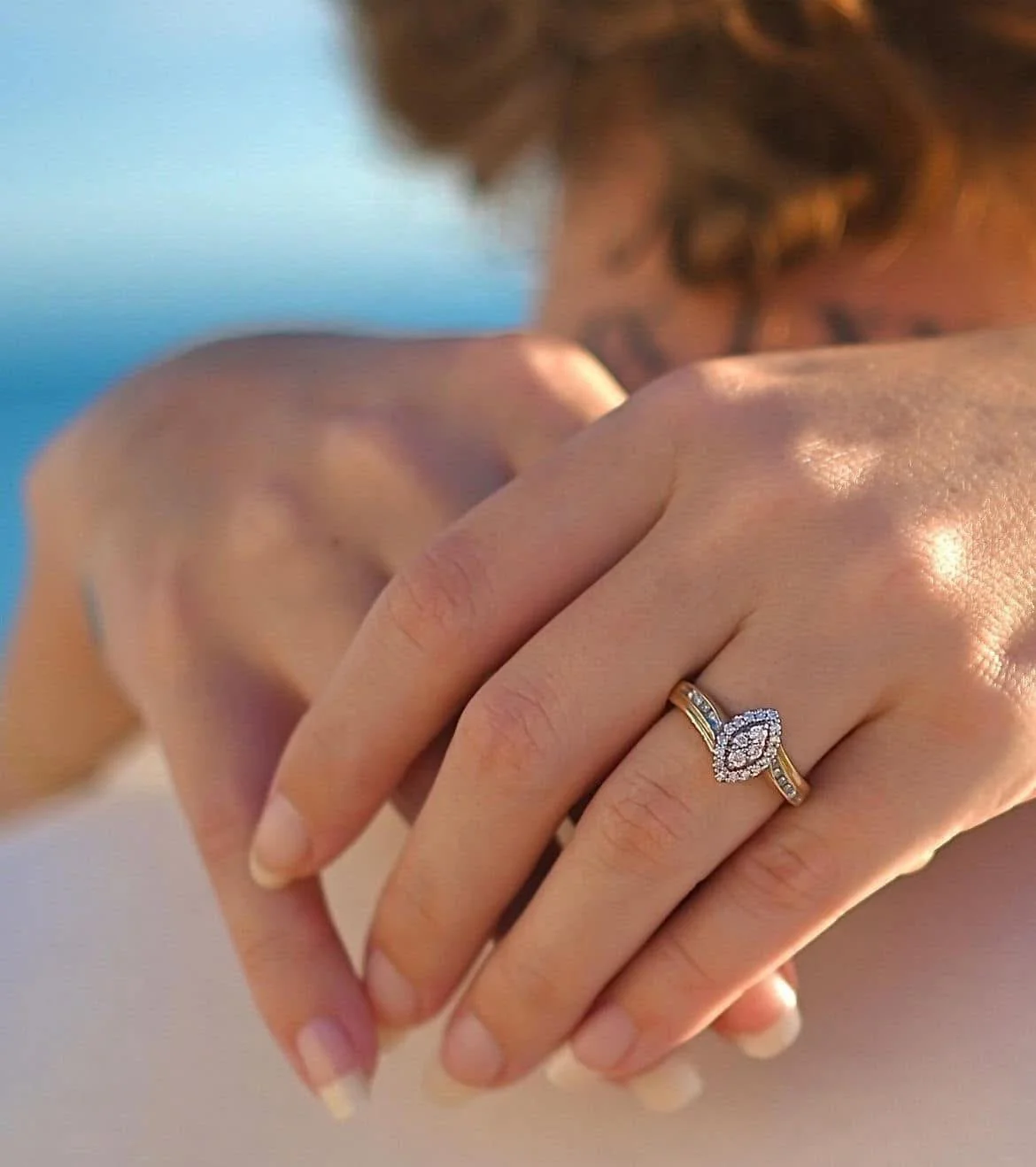 A woman hugging a man, showing her hand with a tattoo, a diamond ring, a gold watch, and long manicured nails, at the beach.