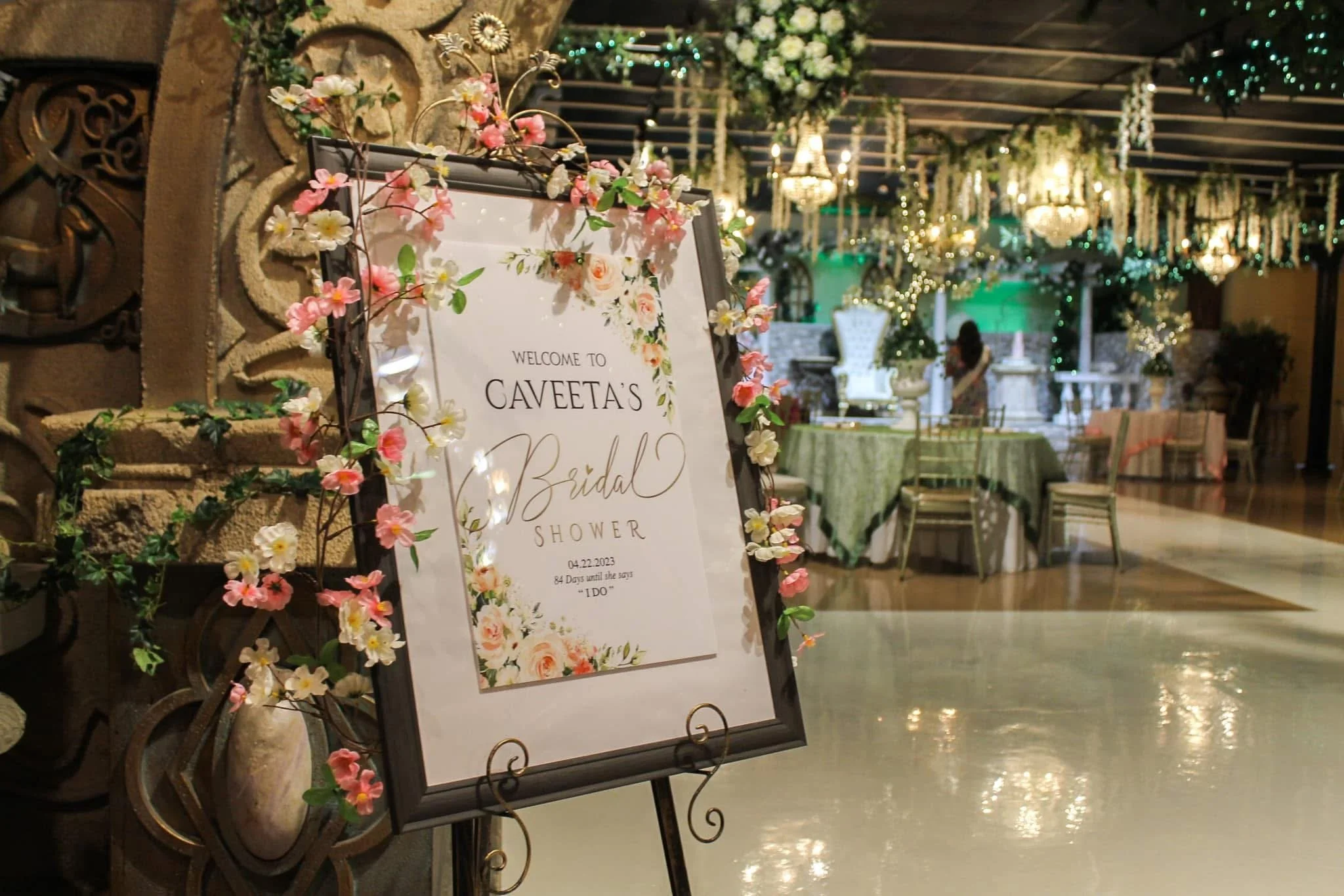 Decorative sign at a bridal shower event with floral design, listing the event details, in an elegant decorated venue with tables, chandeliers, and overhead lighting.