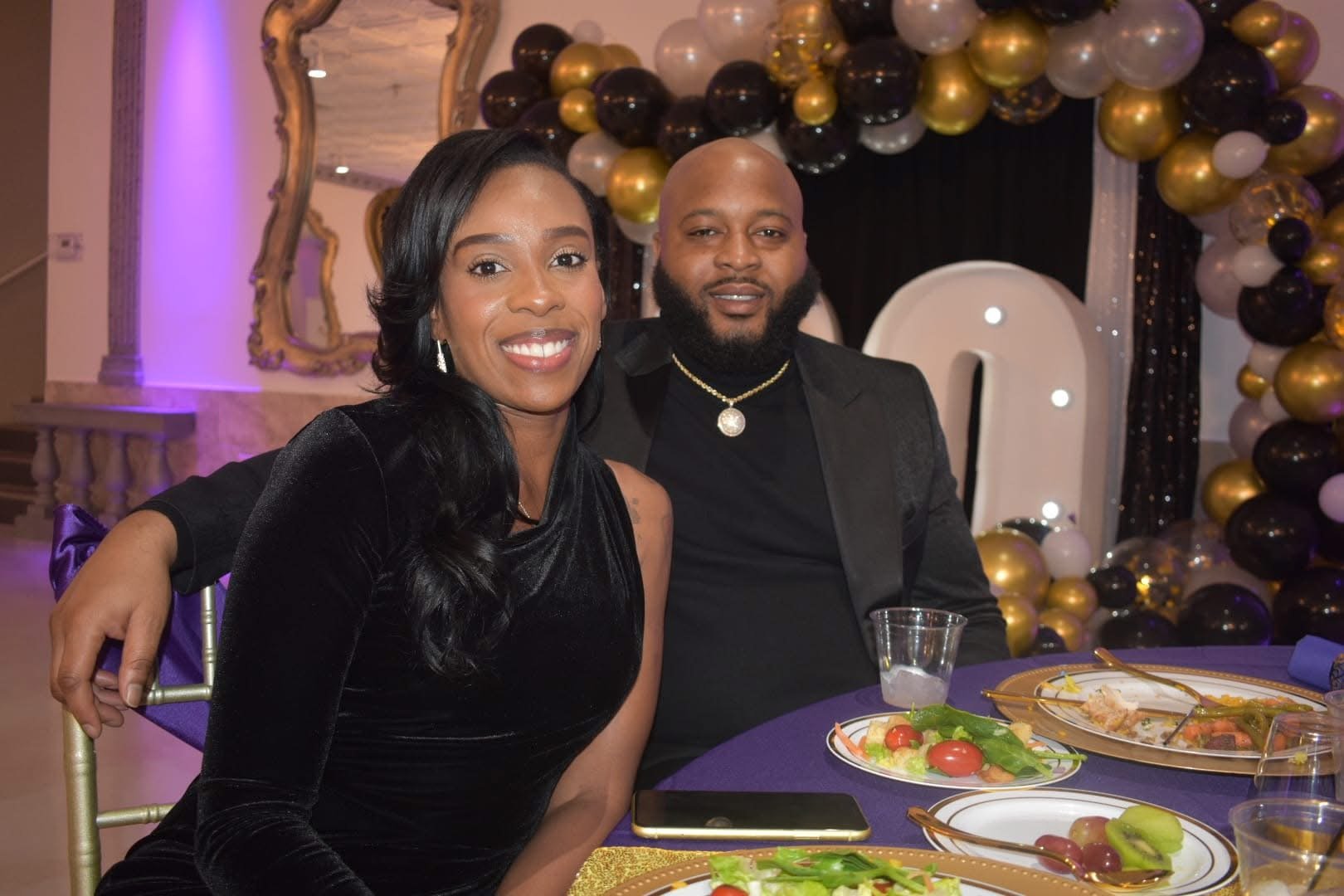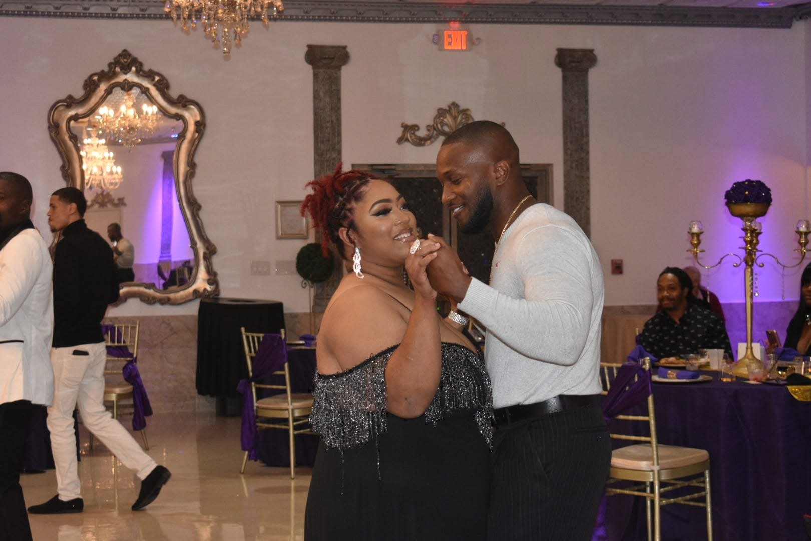 A couple dancing and holding hands at a party or celebration in an elegant decorated room with purple and gold accents.