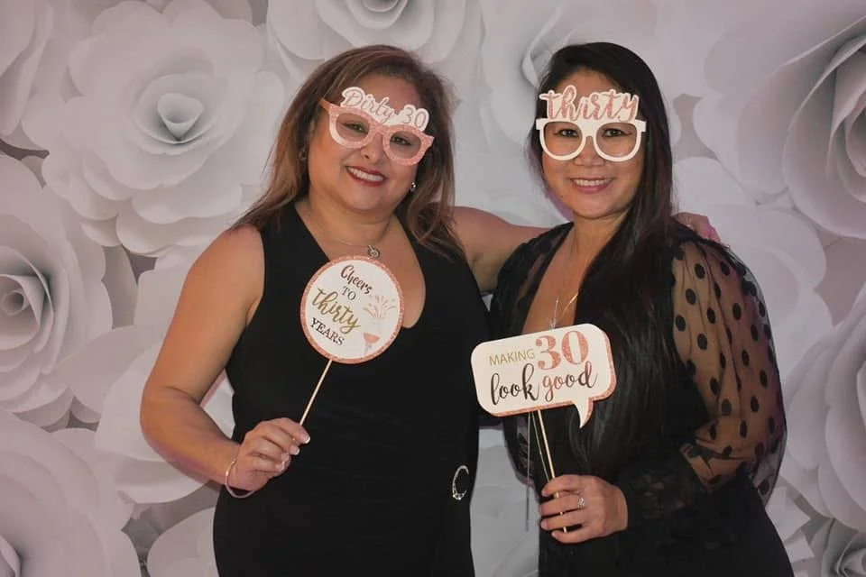 A smiling woman and a man sitting together at a formal event with decorated tables and balloon arch in the background.