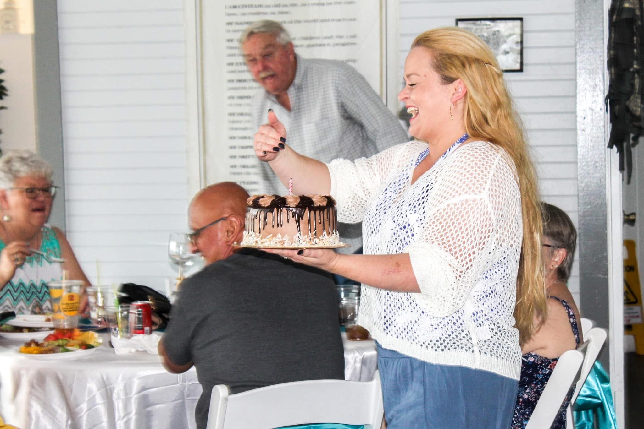 A woman with long blonde hair holding a chocolate birthday cake with a candle, wearing a white crochet top, is smiling and celebrating at a gathering. A man with gray hair stands behind her, smiling, while others are seated at a table with food and d